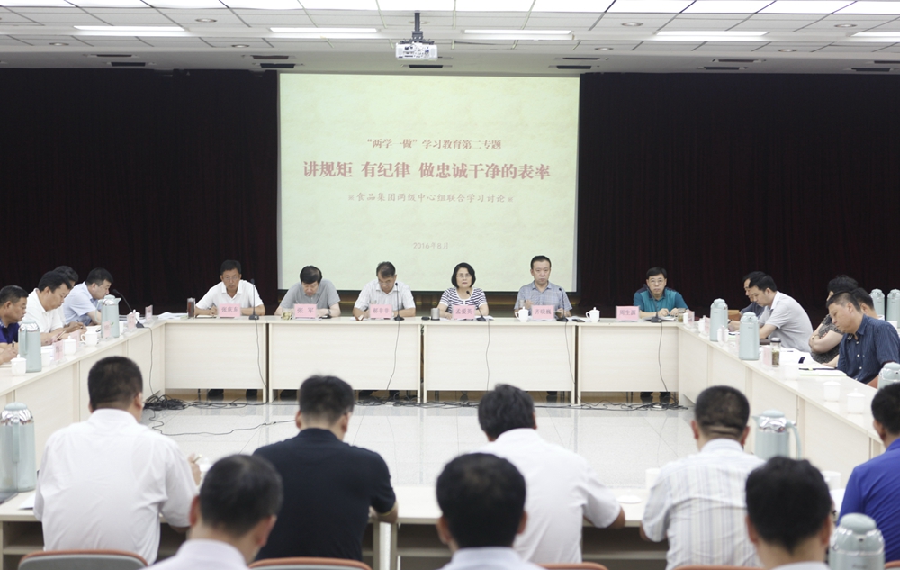 集團黨委書記、董事長孟愛英從增強黨紀黨規意識的重要性、黨員領導干部如何發揮模范作用做講規矩有紀律的表率、各級黨組織和紀委如何進一步強化監督執紀問責等三方面,結合個人學習收獲和食品集團實際首先帶頭談體會。集團黨委常委和直屬單位5位代表也分別圍繞“講規矩 有紀律做忠誠干凈的表率”主題,結合習近平總書記“七一”重要講話精神、違紀違法反面典型與個人實際相聯系進行了交流發言。最后,孟愛英對集團如何開展好“兩學一做”第三專題學習討論提出要求。